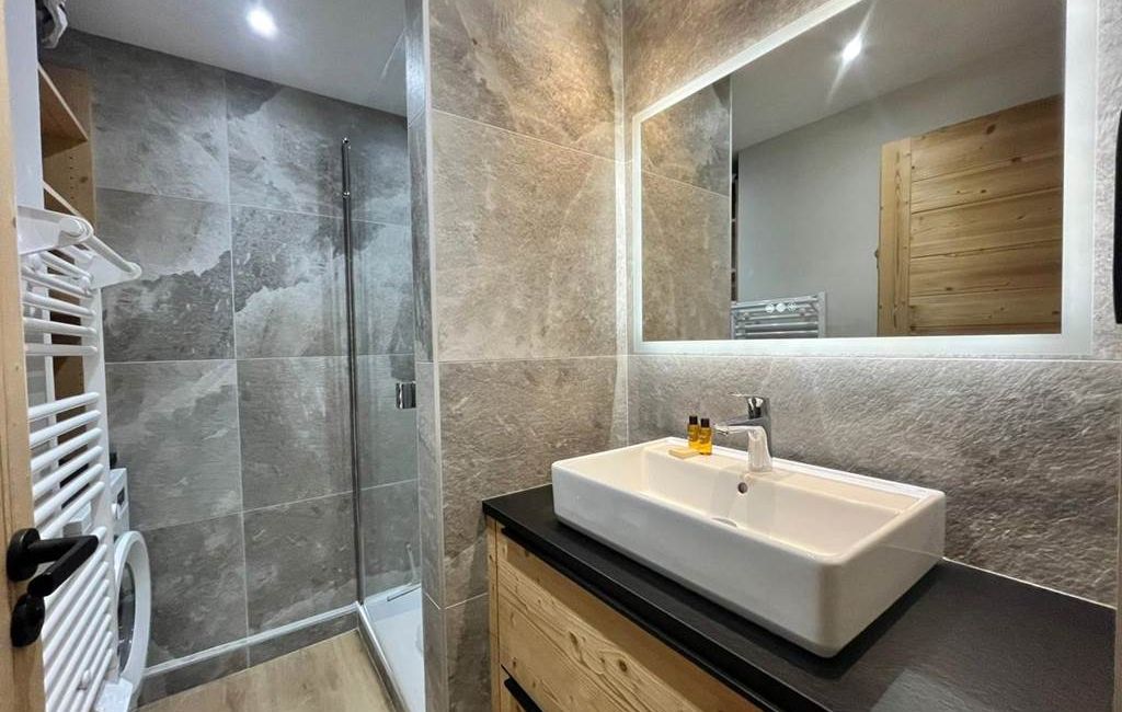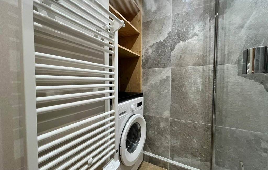 La salle d’eau, moderne et élégante, est équipée d’un lave-linge, d’un sèche-serviettes et d’un sèche-cheveux. Les WC sont séparés et disposent d’un éclairage avec détecteur de mouvement, offrant un confort supplémentaire au quotidien.