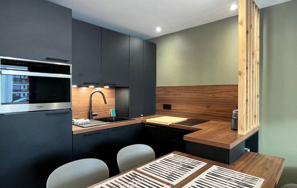 La cuisine ouverte sur le séjour est entièrement équipée et pensée pour les amateurs de convivialité. Elle comprend un lave-vaisselle, une plaque à induction, un four micro-ondes, une cafetière, une bouilloire et un grille-pain. L’îlot central permet de cuisiner et de partager un repas tout en profitant d’une vue exceptionnelle sur les sommets environnants.