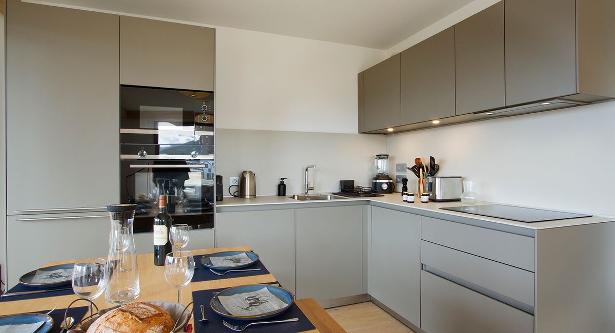 Cet appartement composé d'un séjour salle à manger, une cuisine équipée avec plaques à induction, four, frigo, micro-onde, lave-vaisselle, lave-linge séchant, cafetière Nespresso, grille-pain, bouilloire, presse agrume électrique, batteur, mixeur, appareil à raclette et pierrade. Appareil à fondue